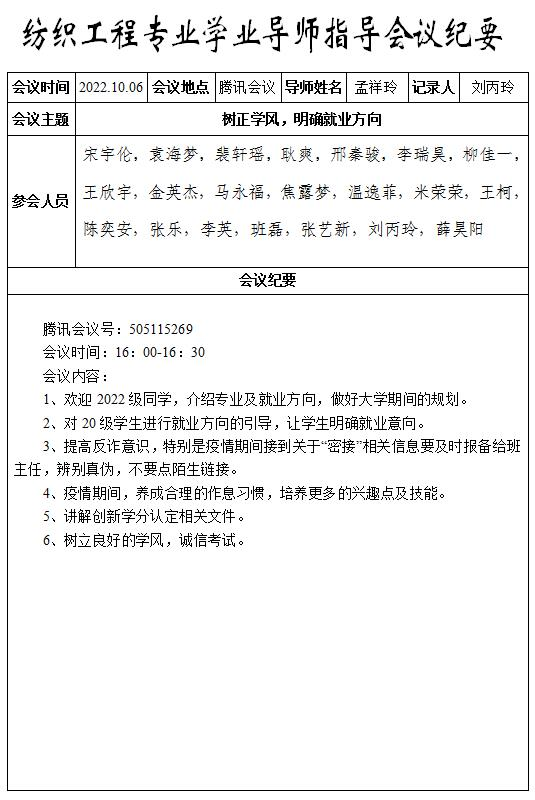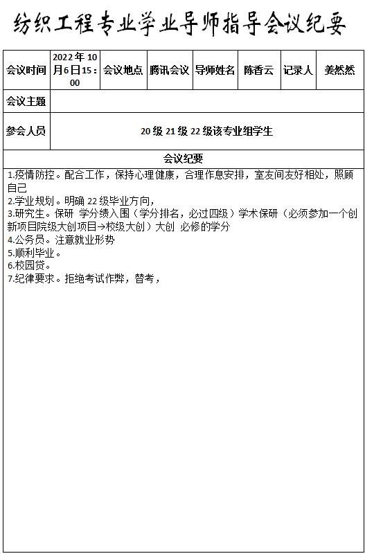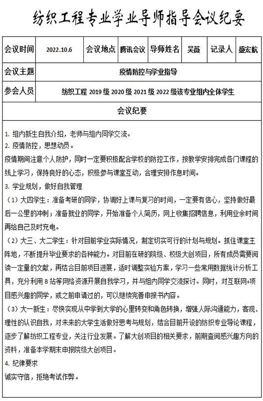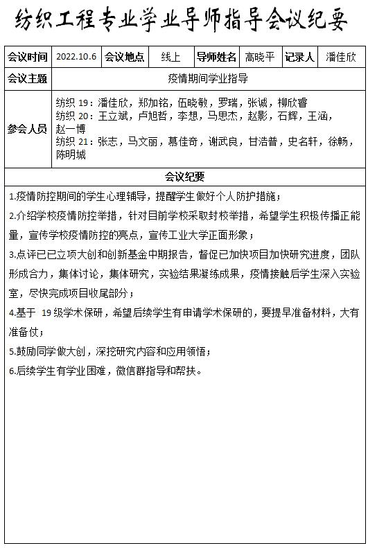 面对严峻复杂的疫情防控形势,按照学校“疫情就是命令,防控就是责任”的要求,学院近期实行封闭管理和线上教学,纺织工程系积极部署、认真落实,组织22名学业导师集中开展了线上学业指导活动。